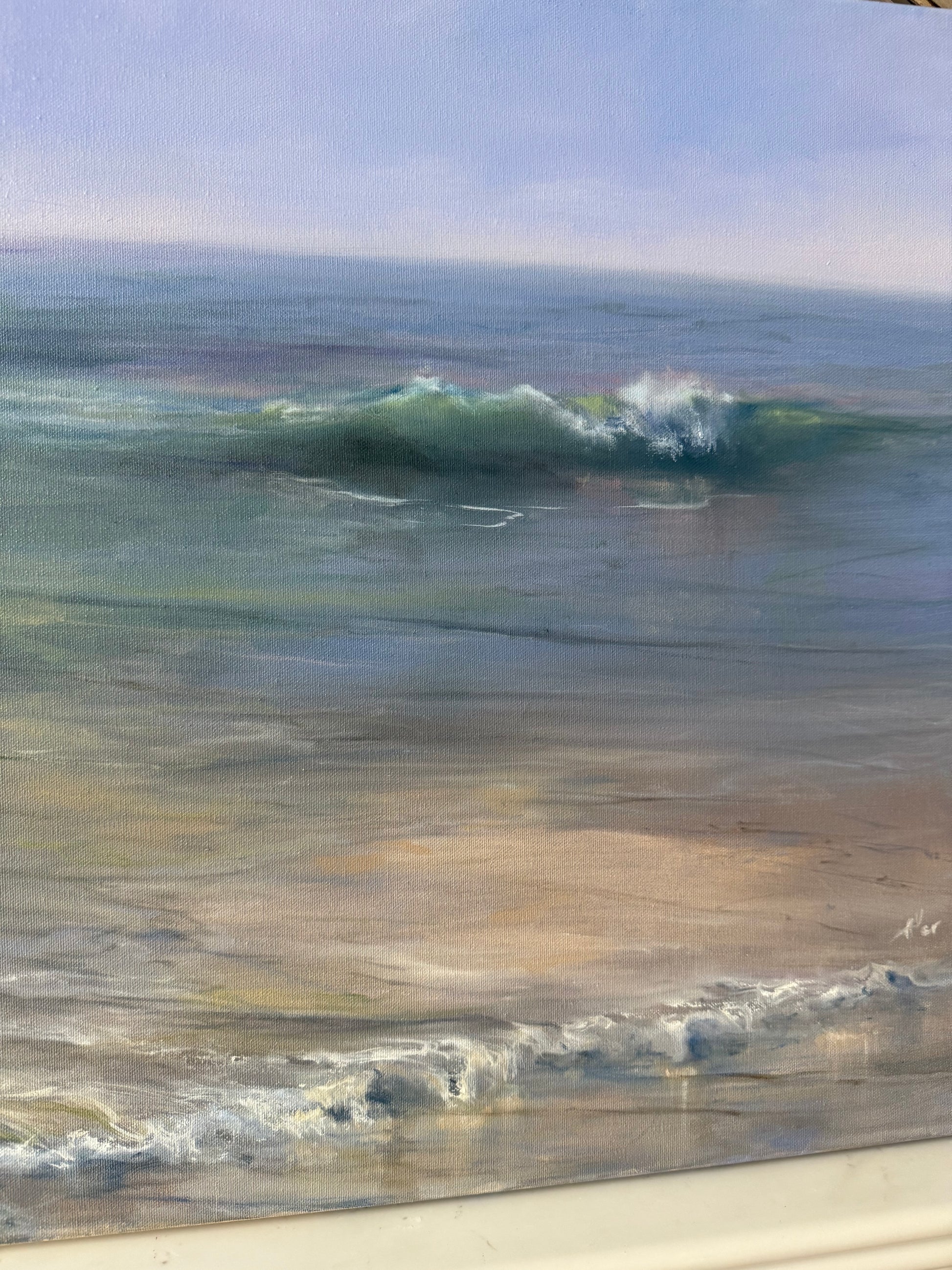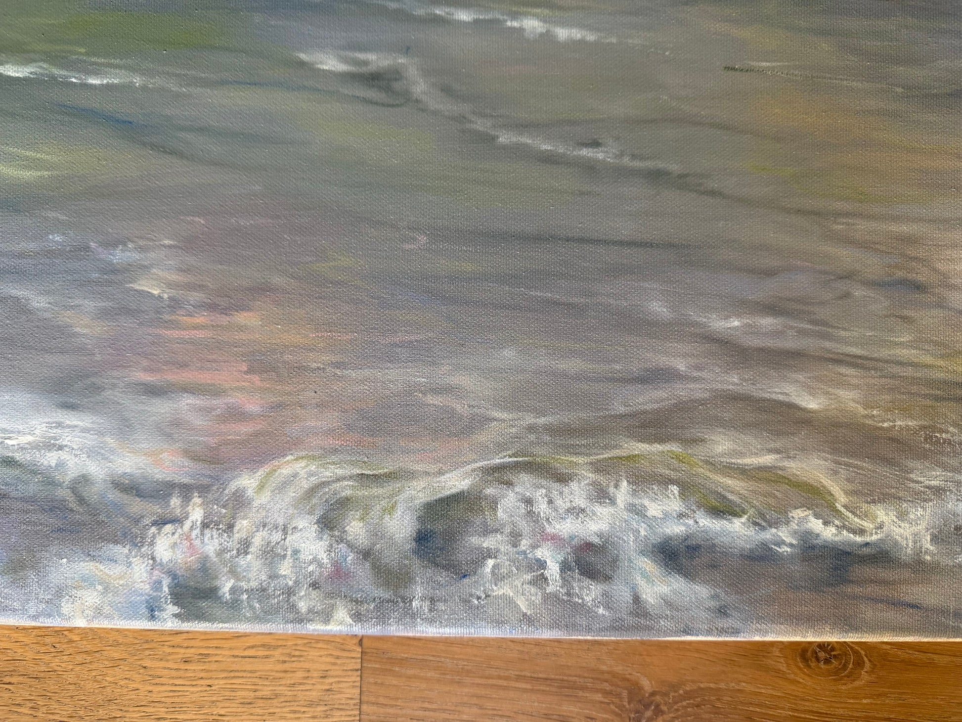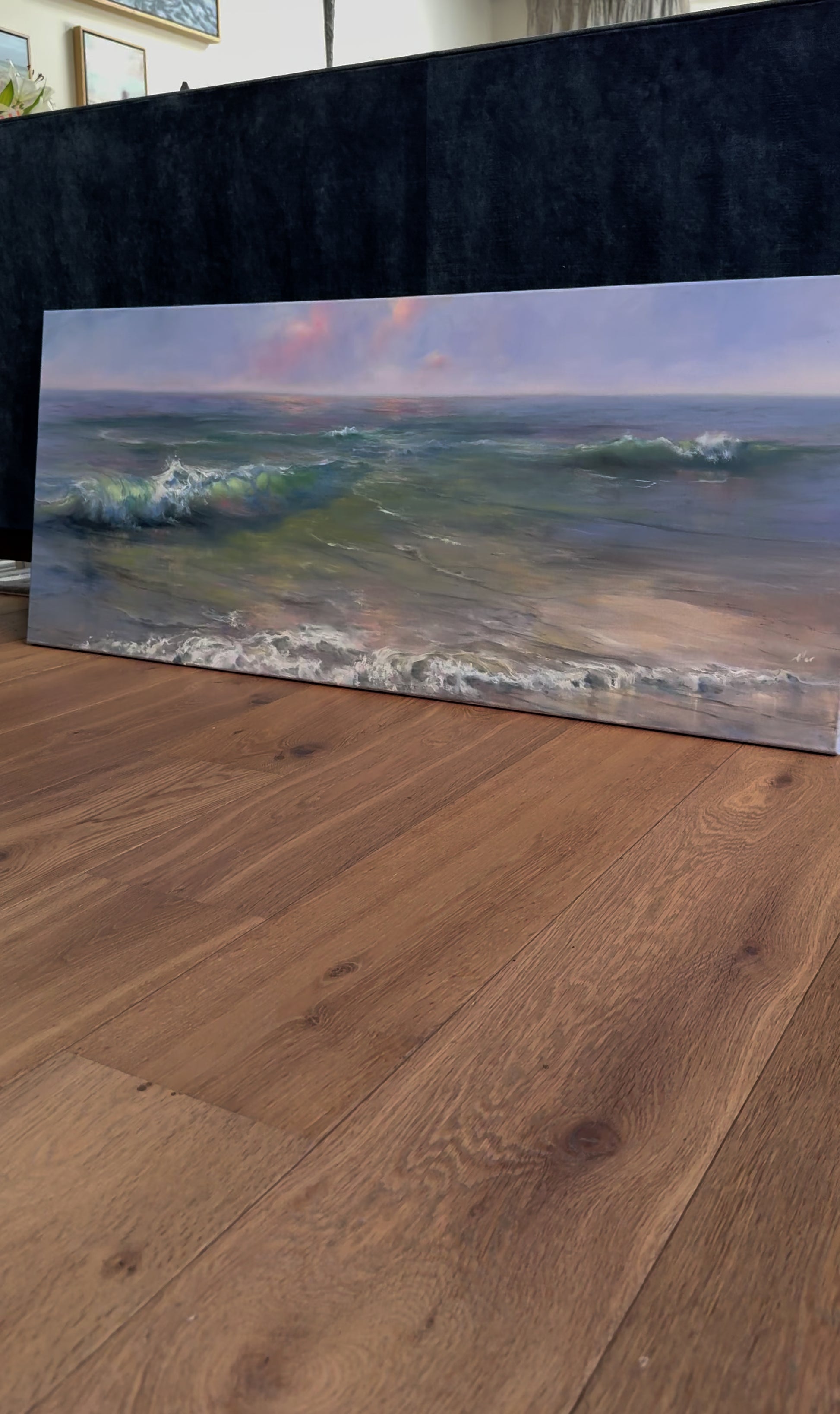 In this painting I wanted to capture the ephemeral beauty of the ever-changing moods of the sea. A blend of impressionism and realism allowed me to reflect the gentle play of light on the rolling waves, inviting a sense of peace and reflection. I have imbued each stroke with the emotion of awe at the vast, endless horizon. This artwork embodies a serene escape, bringing a breath of fresh air and tranquillity to any space it graces.