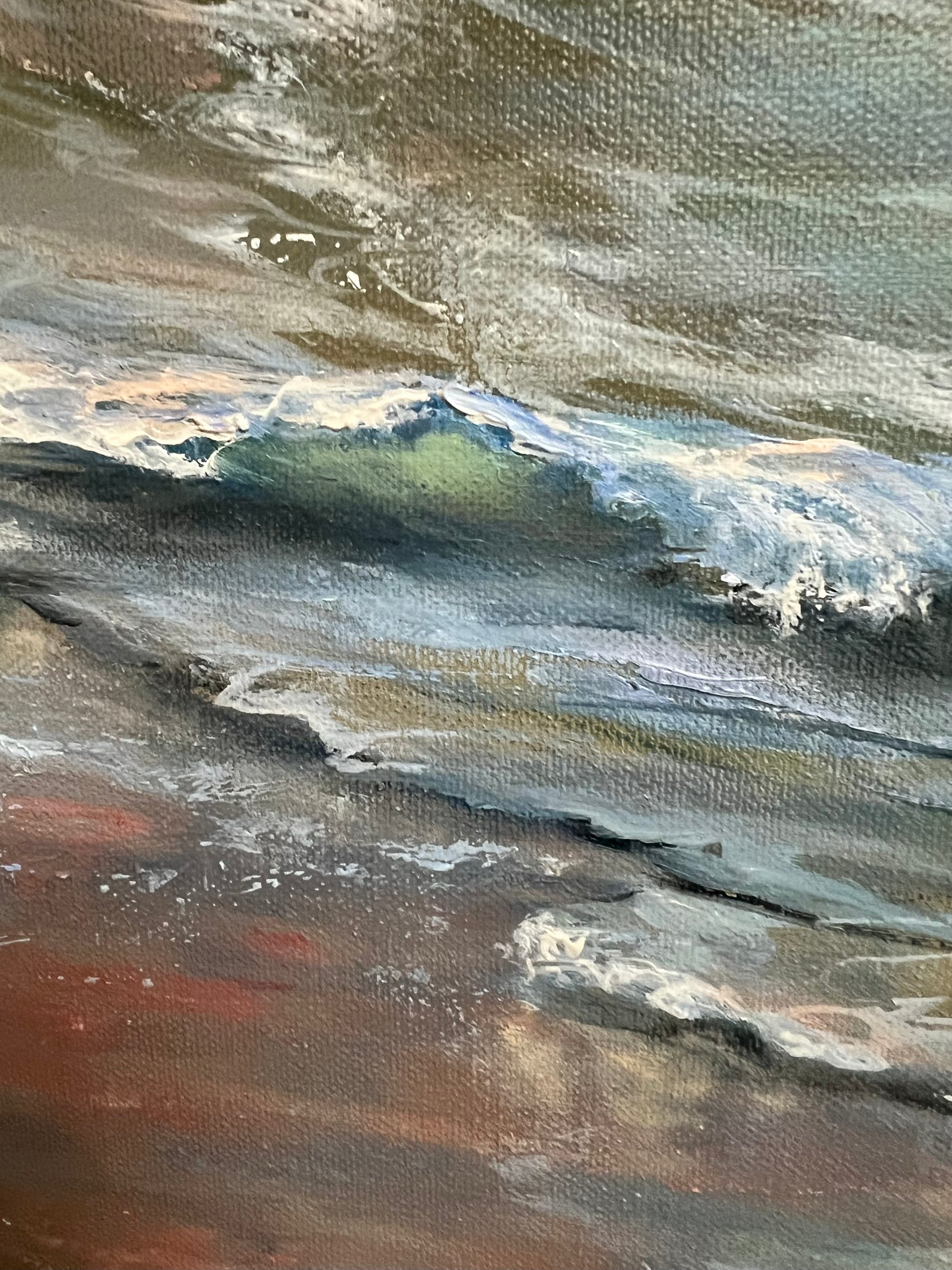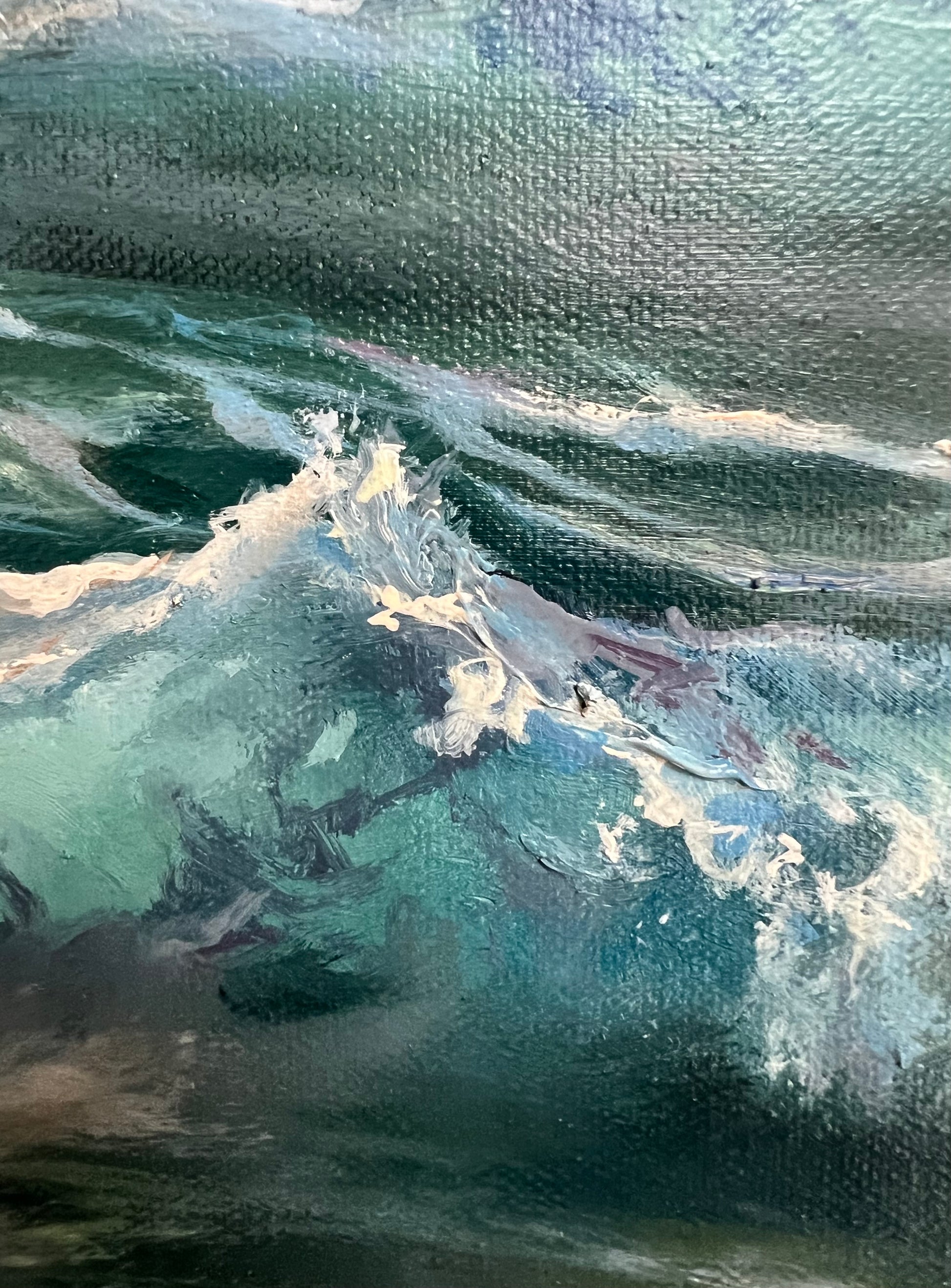 This work of art is inspired by a warm summer afternoons on the coast, by the raw beauty of the ocean, the hypnotic flexibility and power of the glowing great waves, the foamy tides and the ripples on the shore.