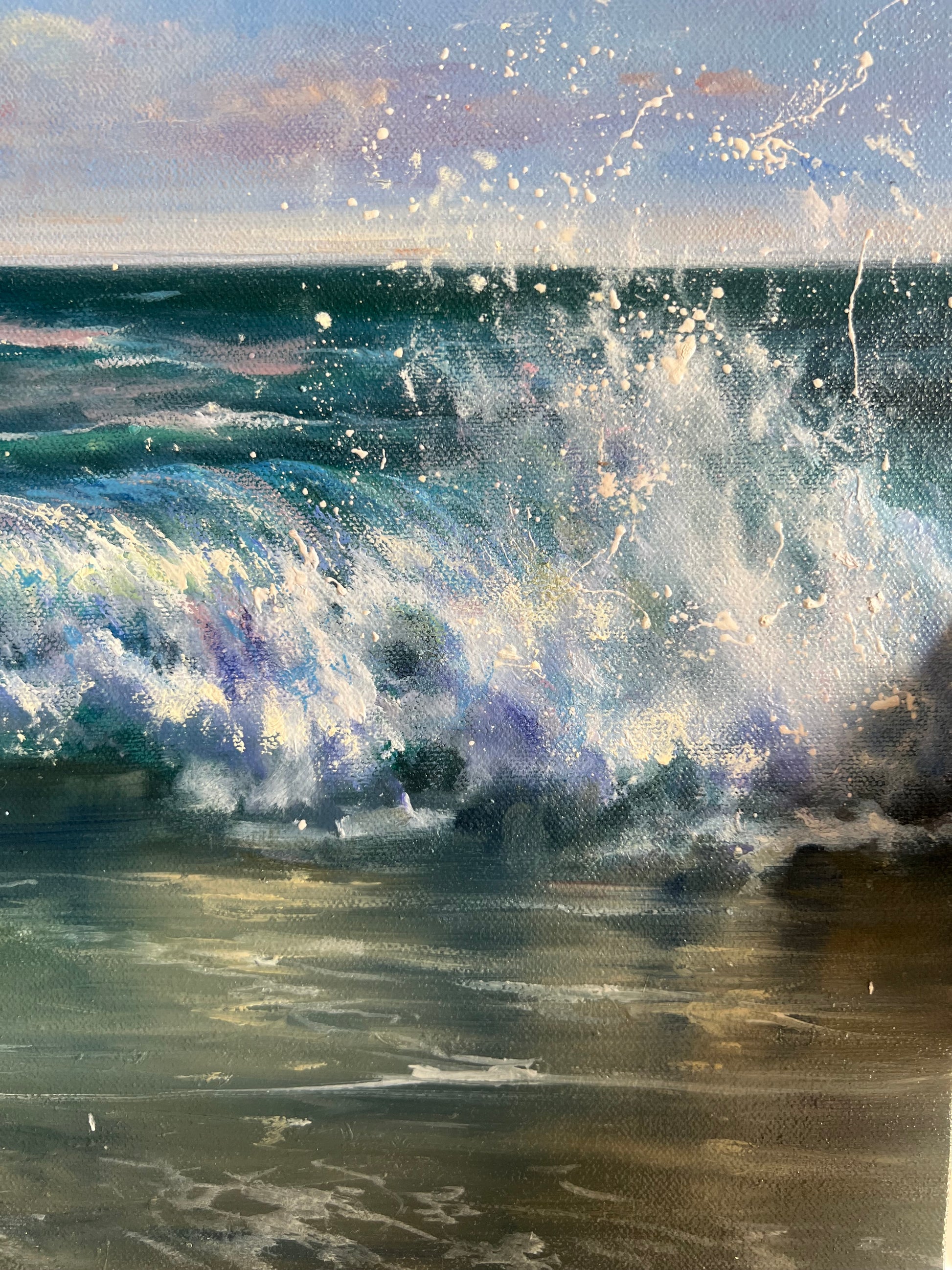 This original artwork is inspired by the warm summer afternoons at the seaside. It draws from the bold beauty of the ocean, the power and flexibility of large arching translucent waves, and the clarity of seawater glazing sandy shores.