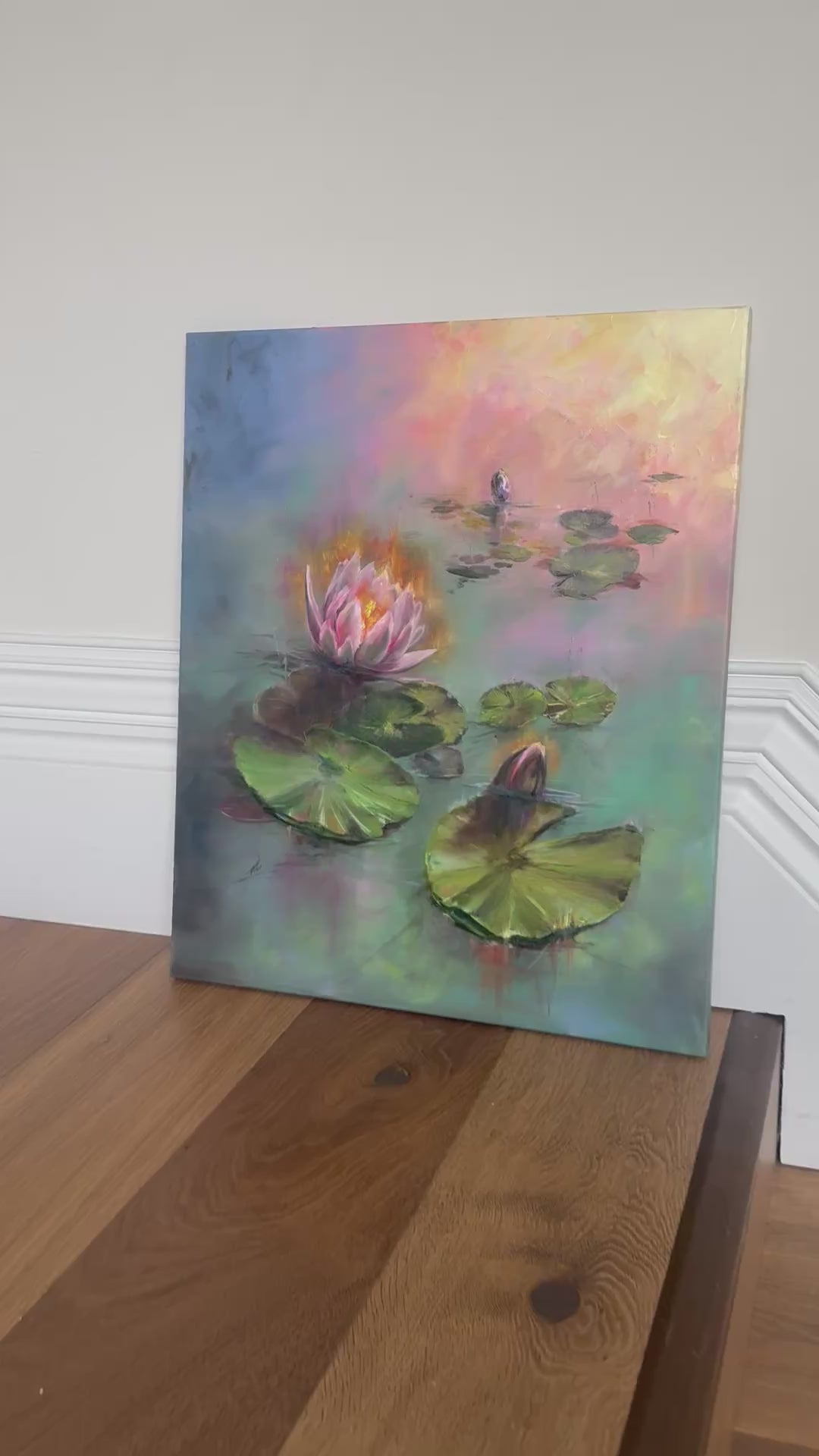 In this oil painting, I aimed to capture the gentle dance of water lilies at dawn. The soft blush of sunrise reflected on the water's surface evokes calm and hope. I wanted to bring the serenity of nature’s quiet moments into your space, filling it with peaceful energy and the promise of new beginnings each day.