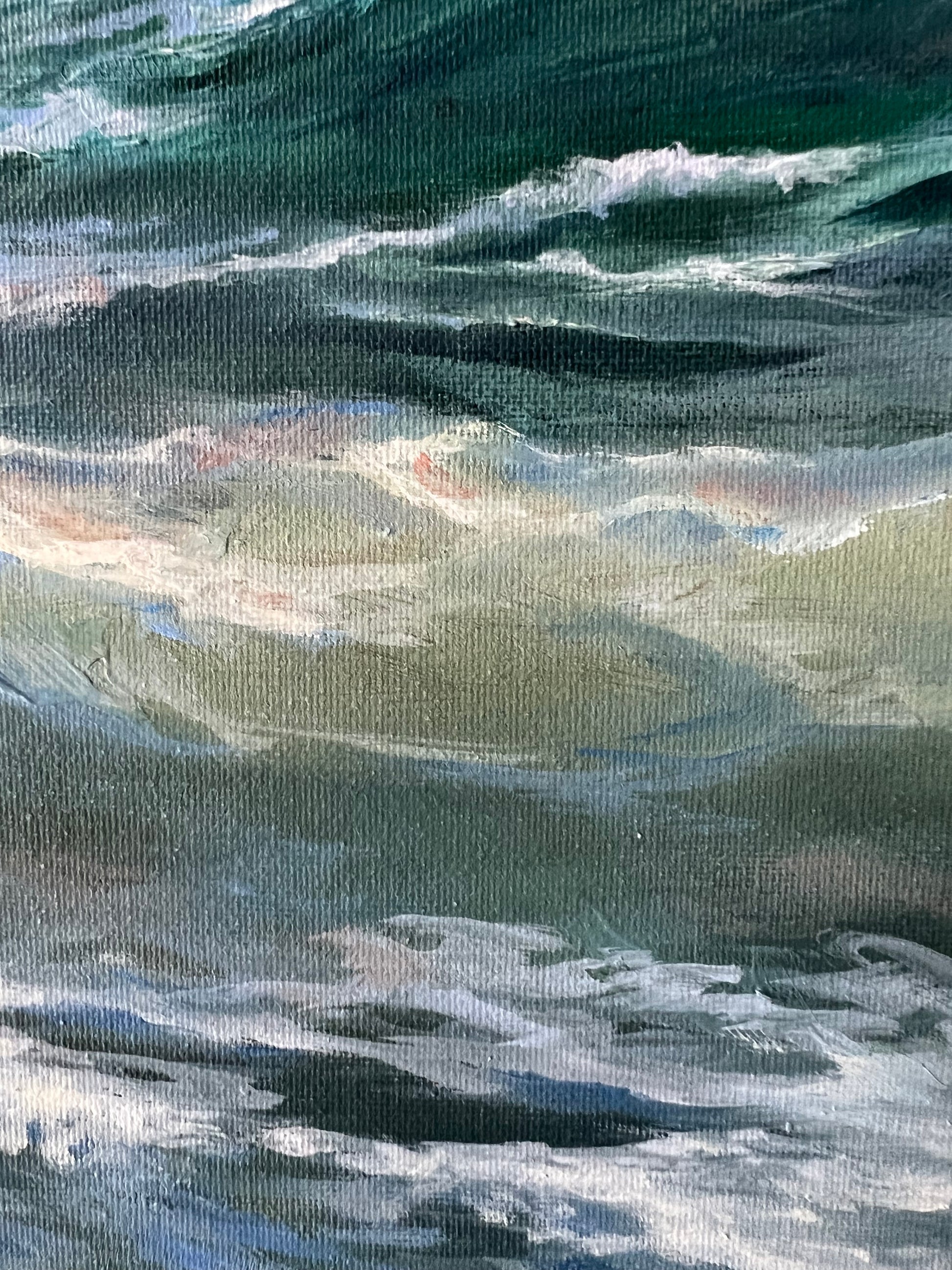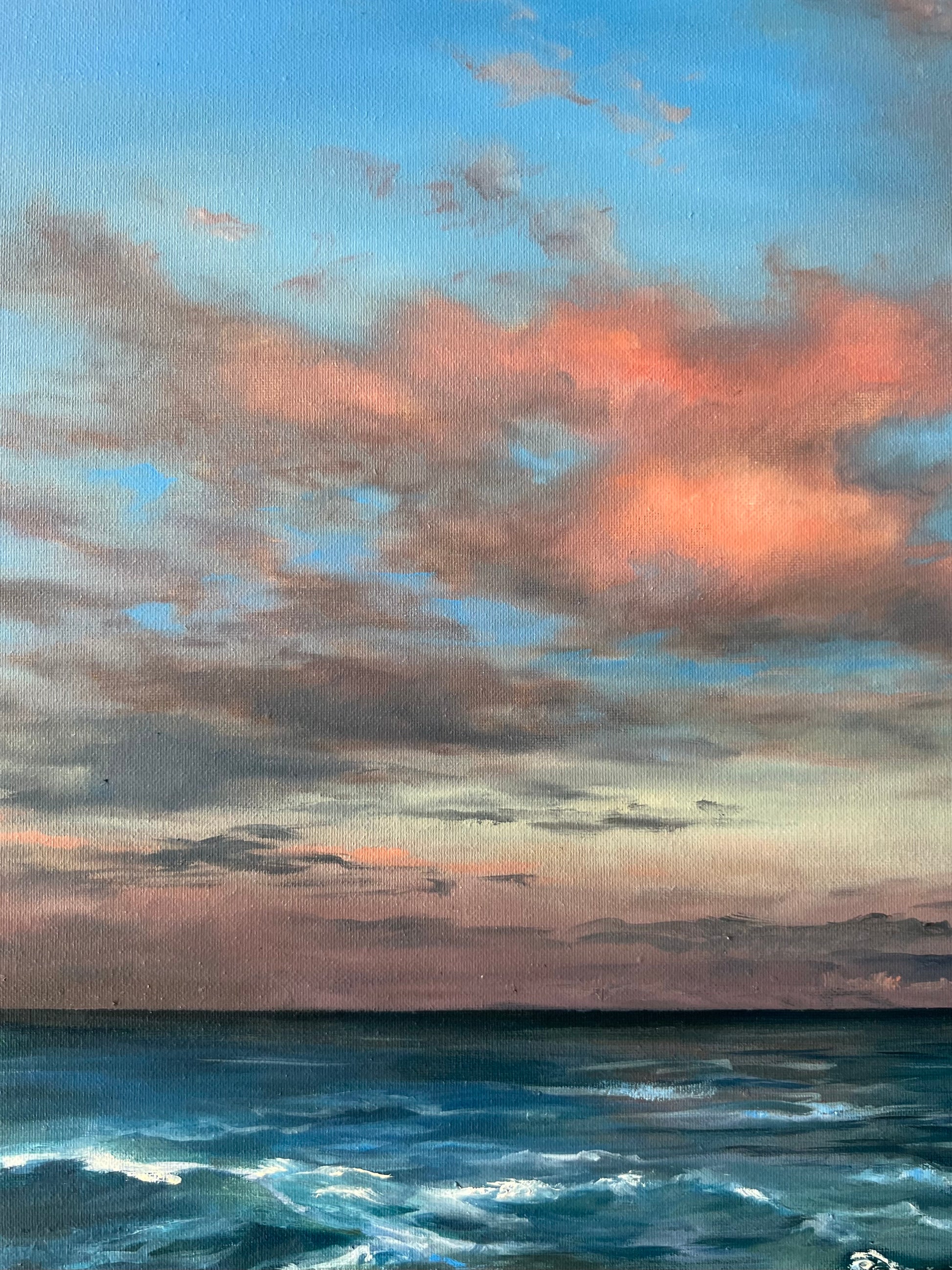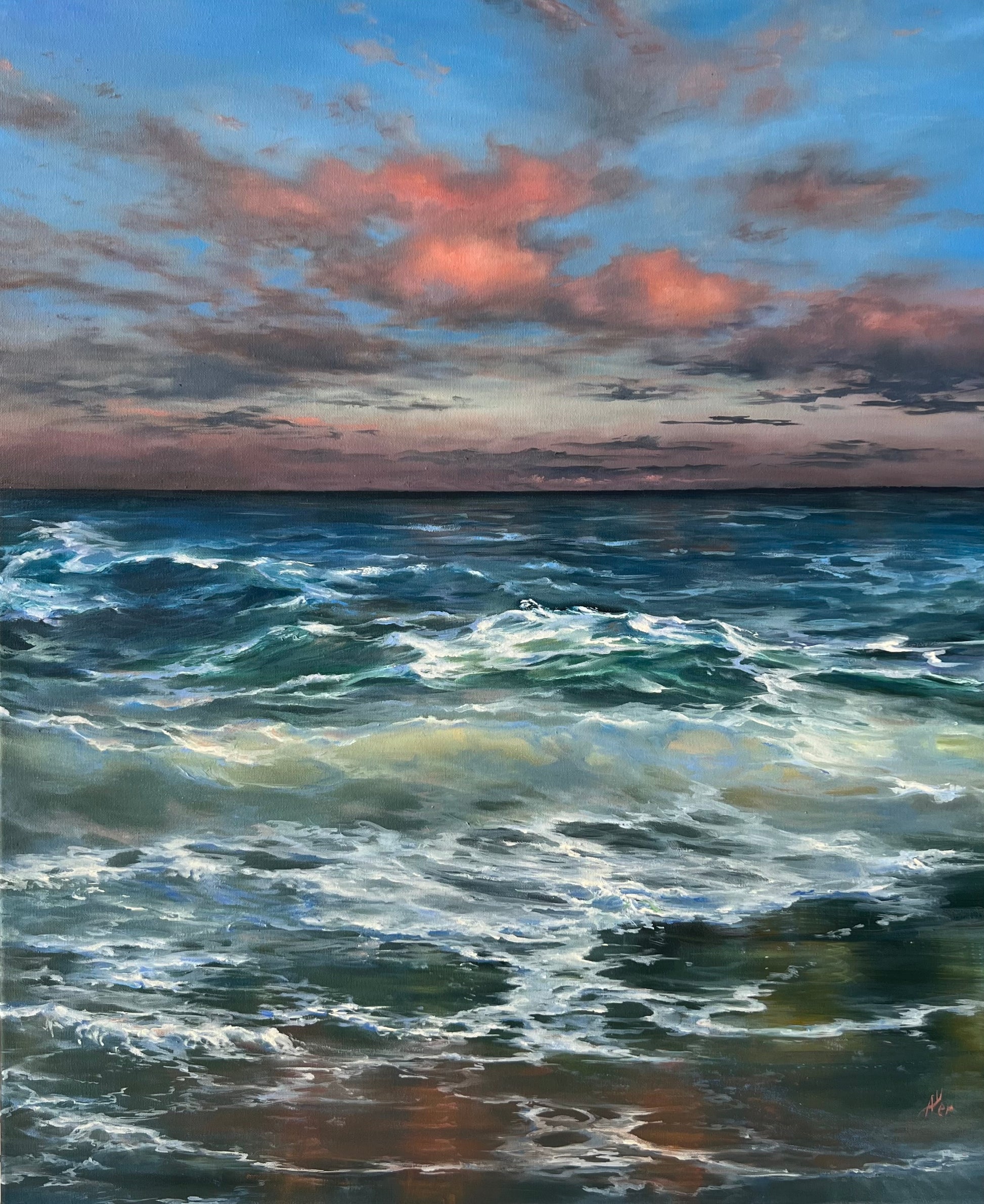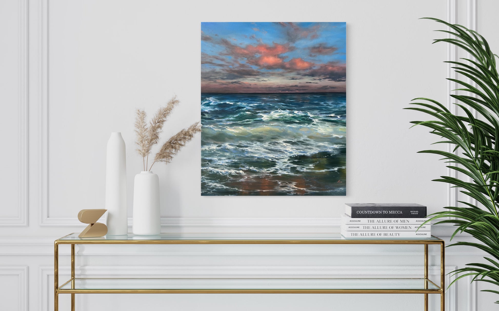 This artwork is inspired by the vastness and beauty of the ocean at sunset, when you can witness hypnotic glow of the clouds above crushing waves and the mesmerising translucency of the seawater.