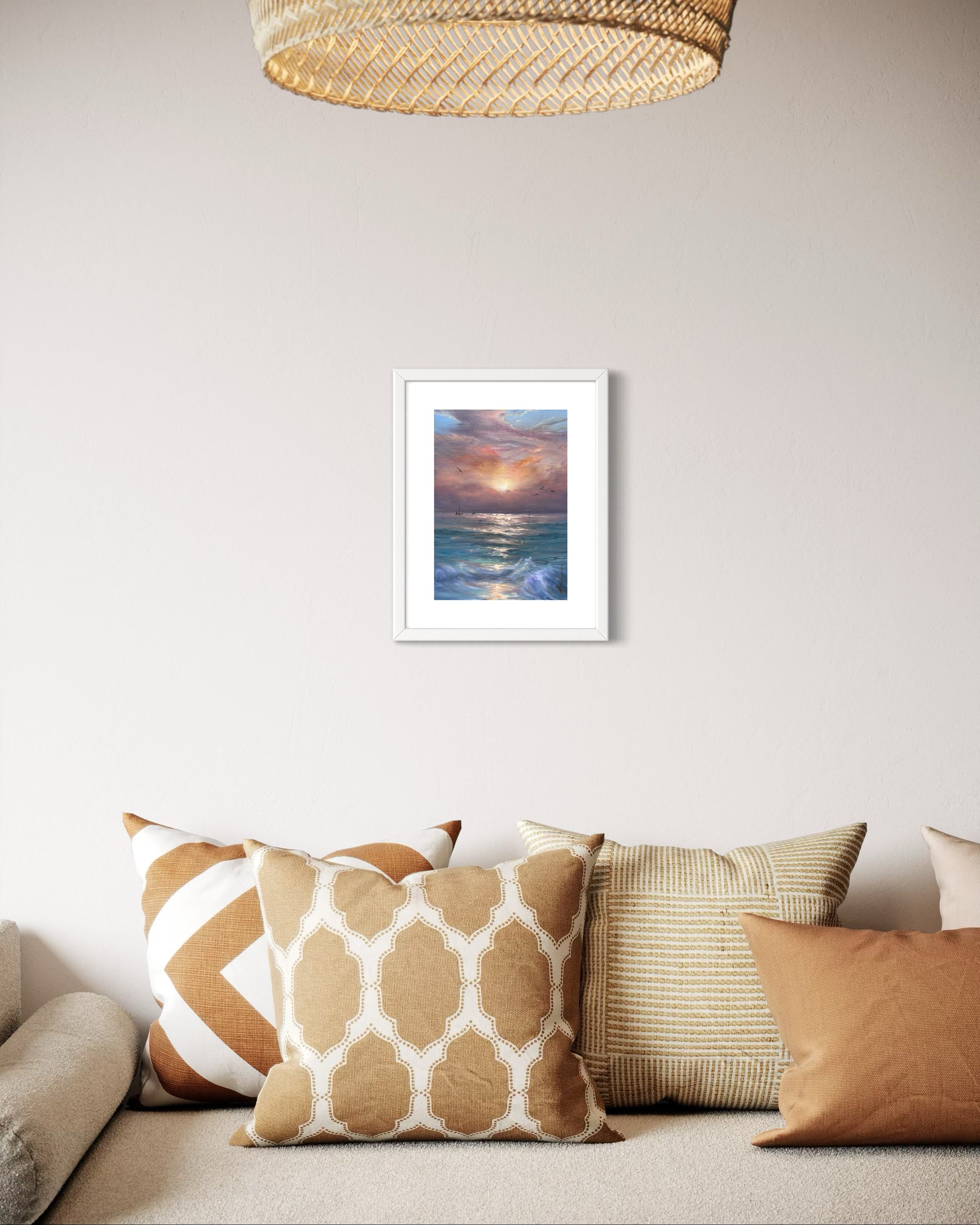 - White wooden frame with the soft mount, 43x33x2.5 cm (17x13 inch), ready to hang.