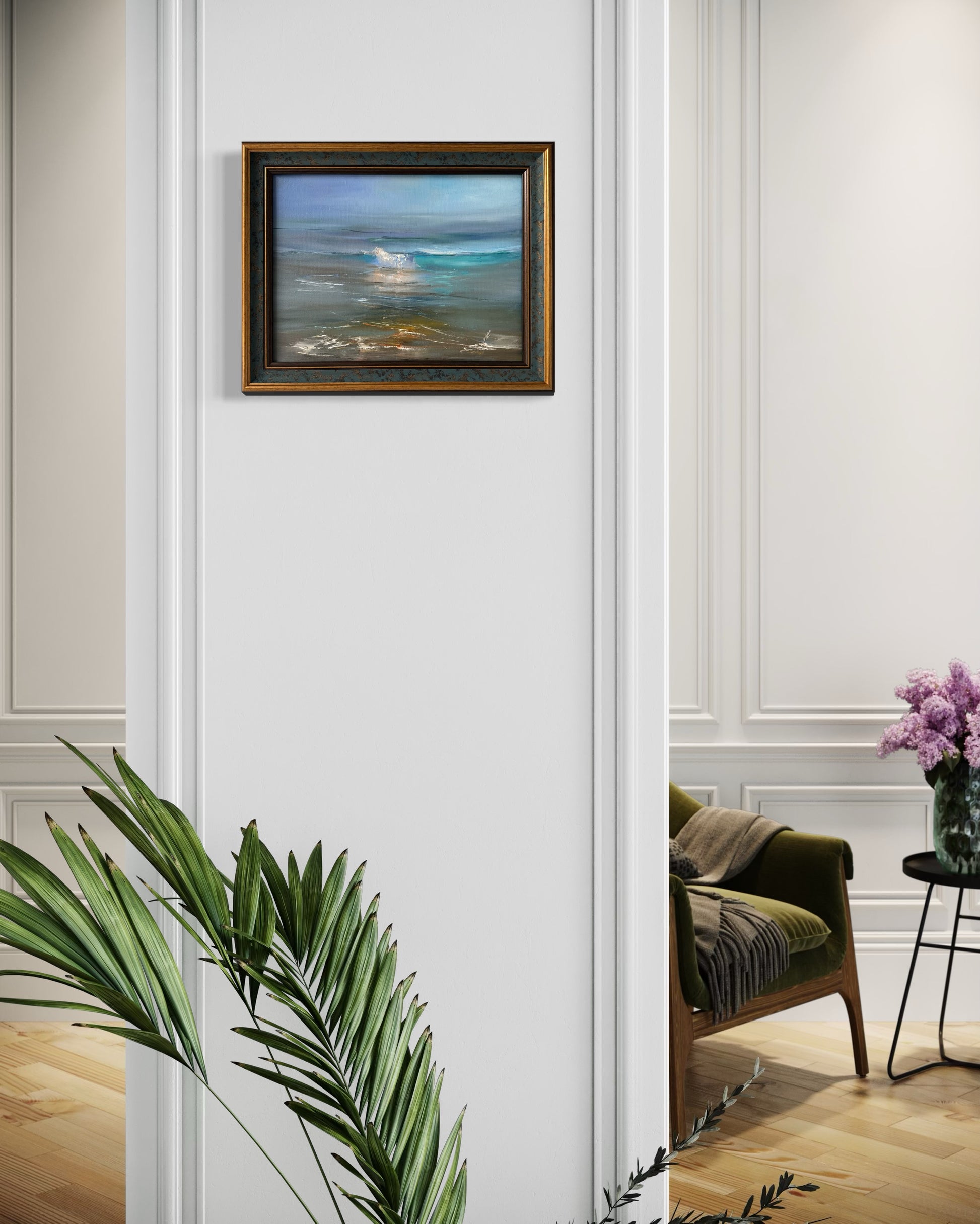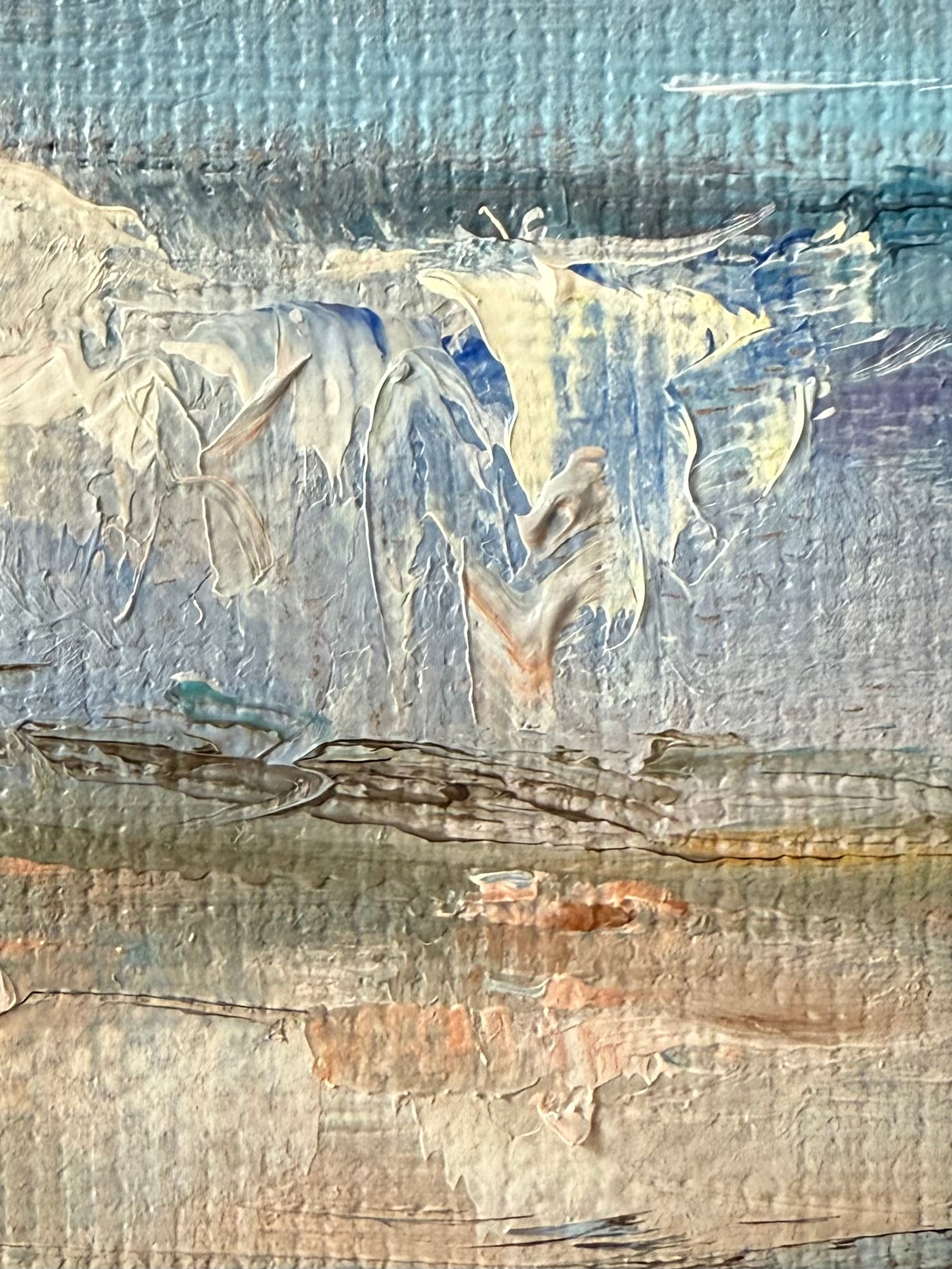 In this oil painting, I've captured the serene yet dynamic essence of the ocean. My pallet knifes blend realism with touches of impressionism, attempting to grasp the fleeting nature of the sea's movement and the profound emotions it stirs. The tranquil hazy blues are background and energetic warm foreground convey a delicate balance, evoking a sense of peacefulness intertwined with the ocean's powerful spirit. Hanging in your home, this artwork will infuse any space with a soothing yet invigorating atmosphere.