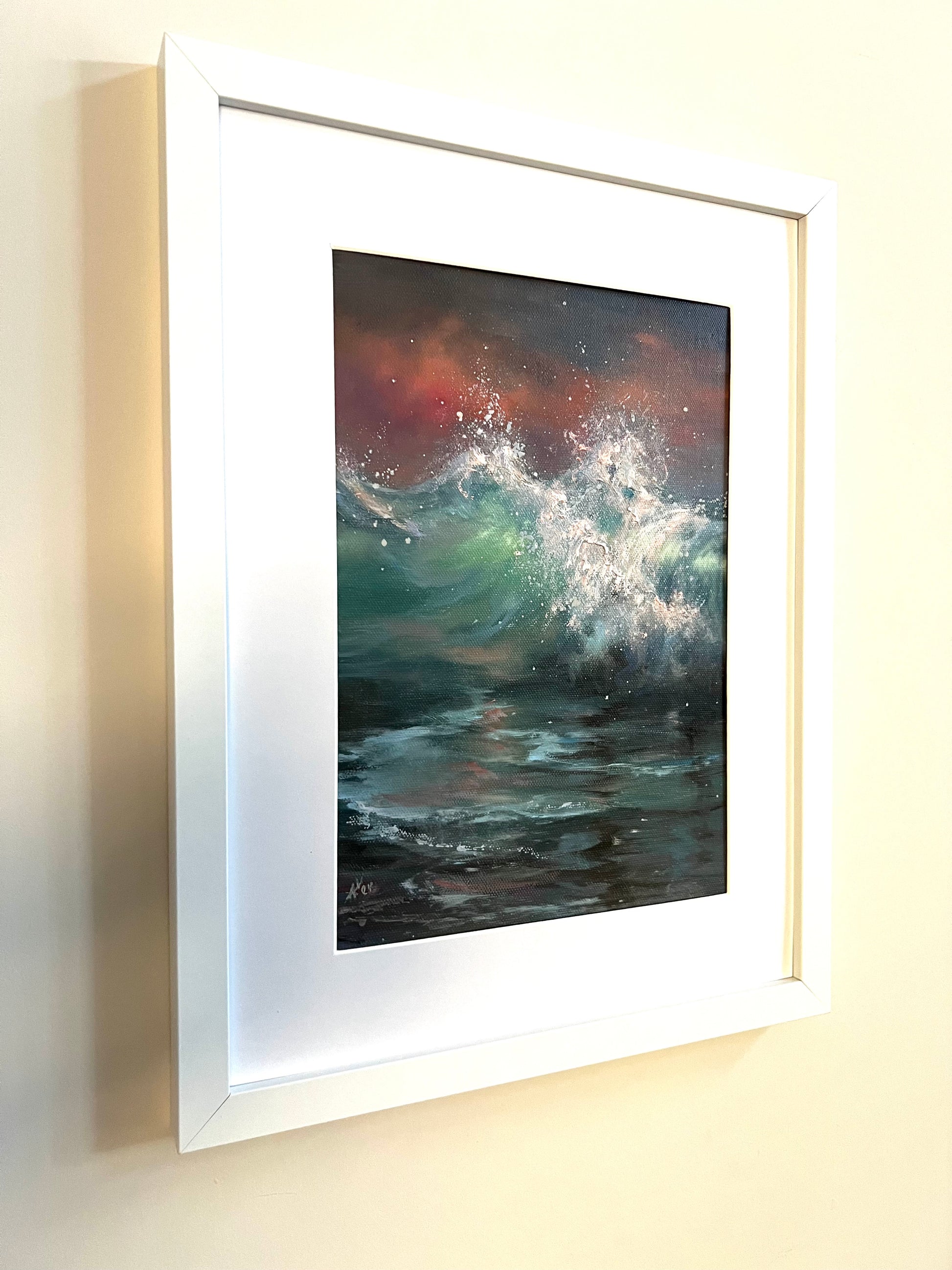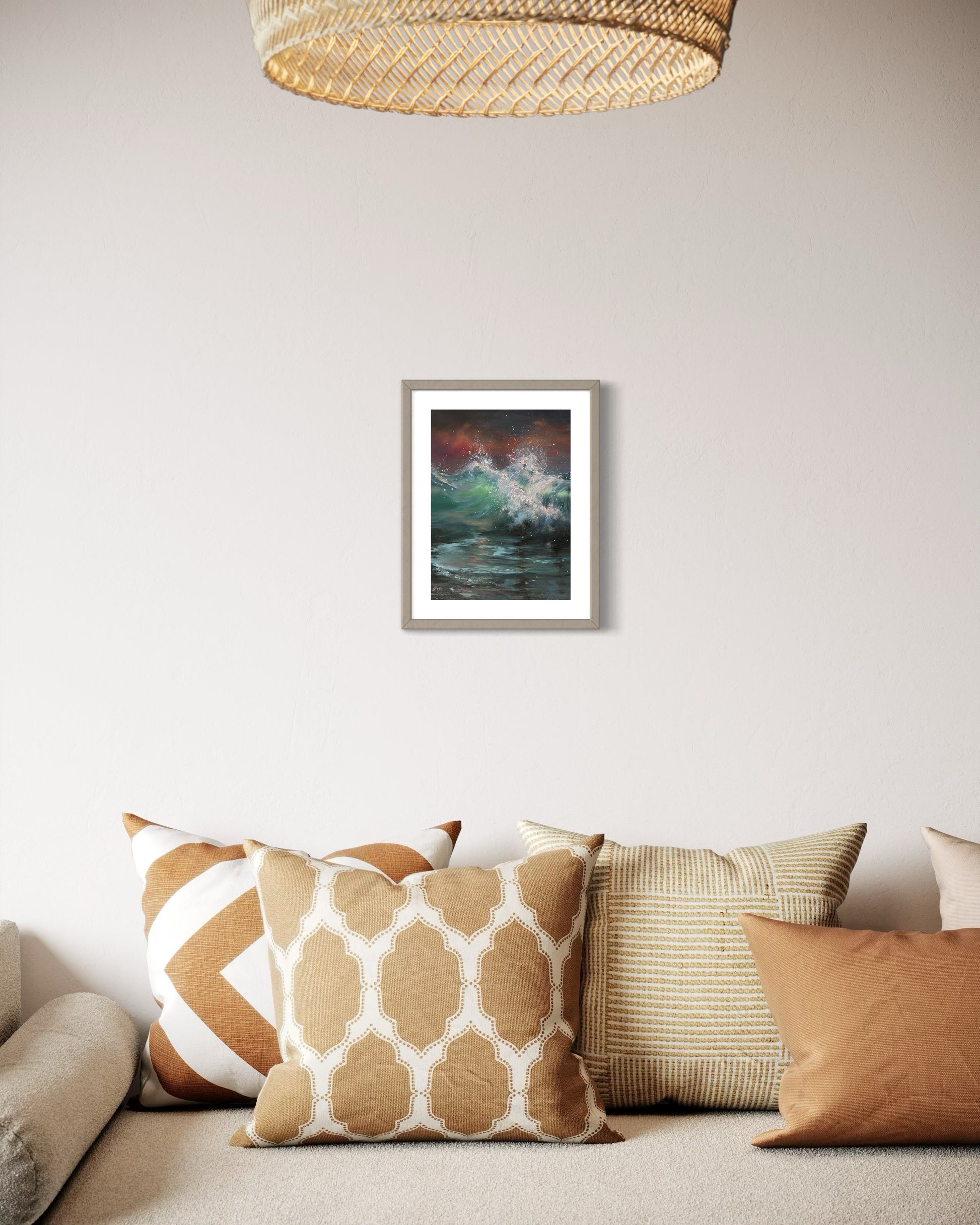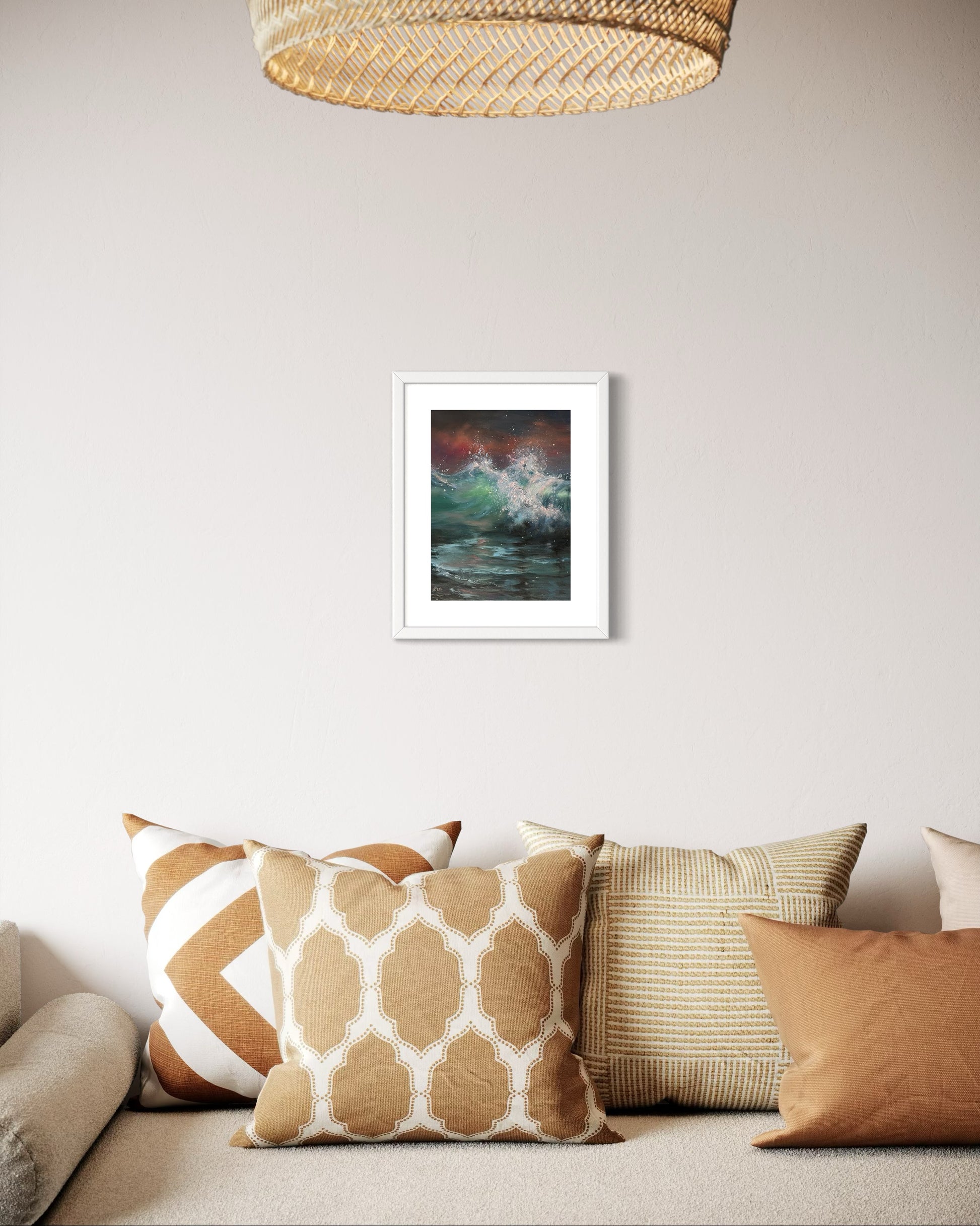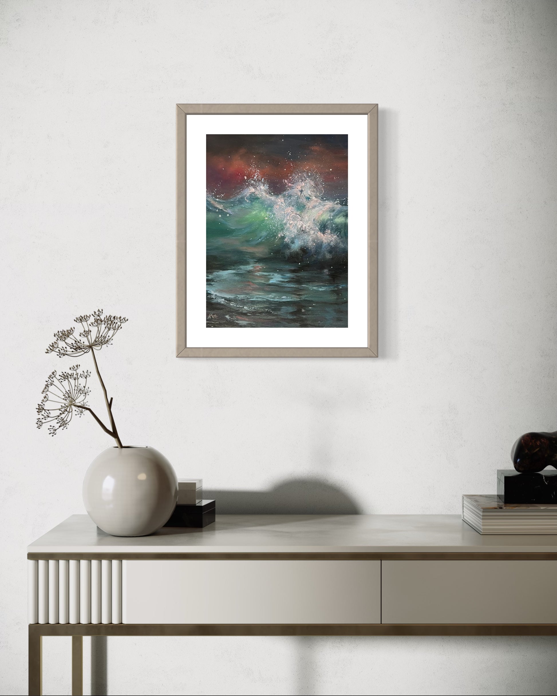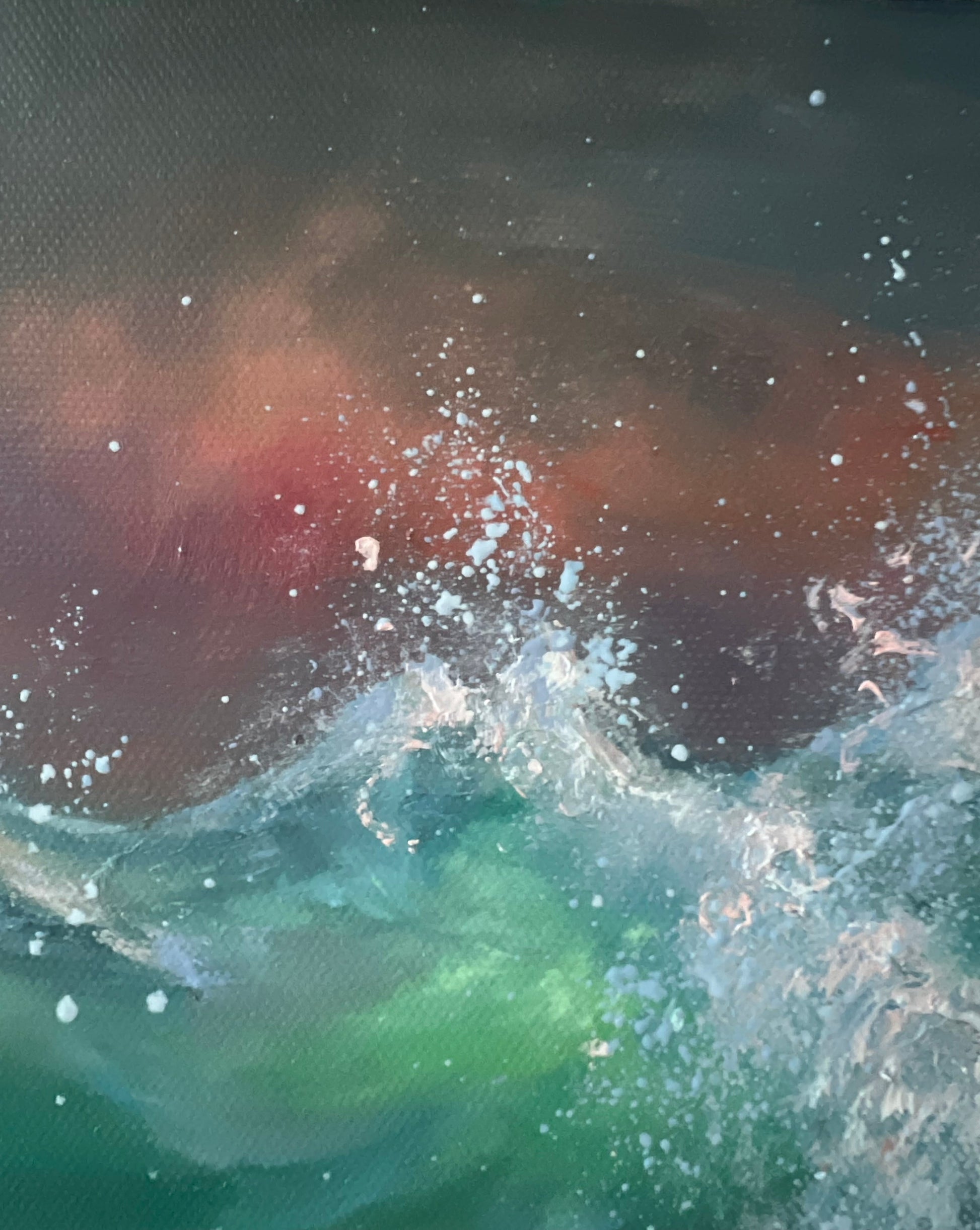 In creating this painting, I sought to capture the raw, untamed spirit of the sea at the break of amazingly warm summer dawn. The dynamic interplay of tumultuous waves against spectacular and moody sky reflects life's constant motion—its challenges and beauty.
