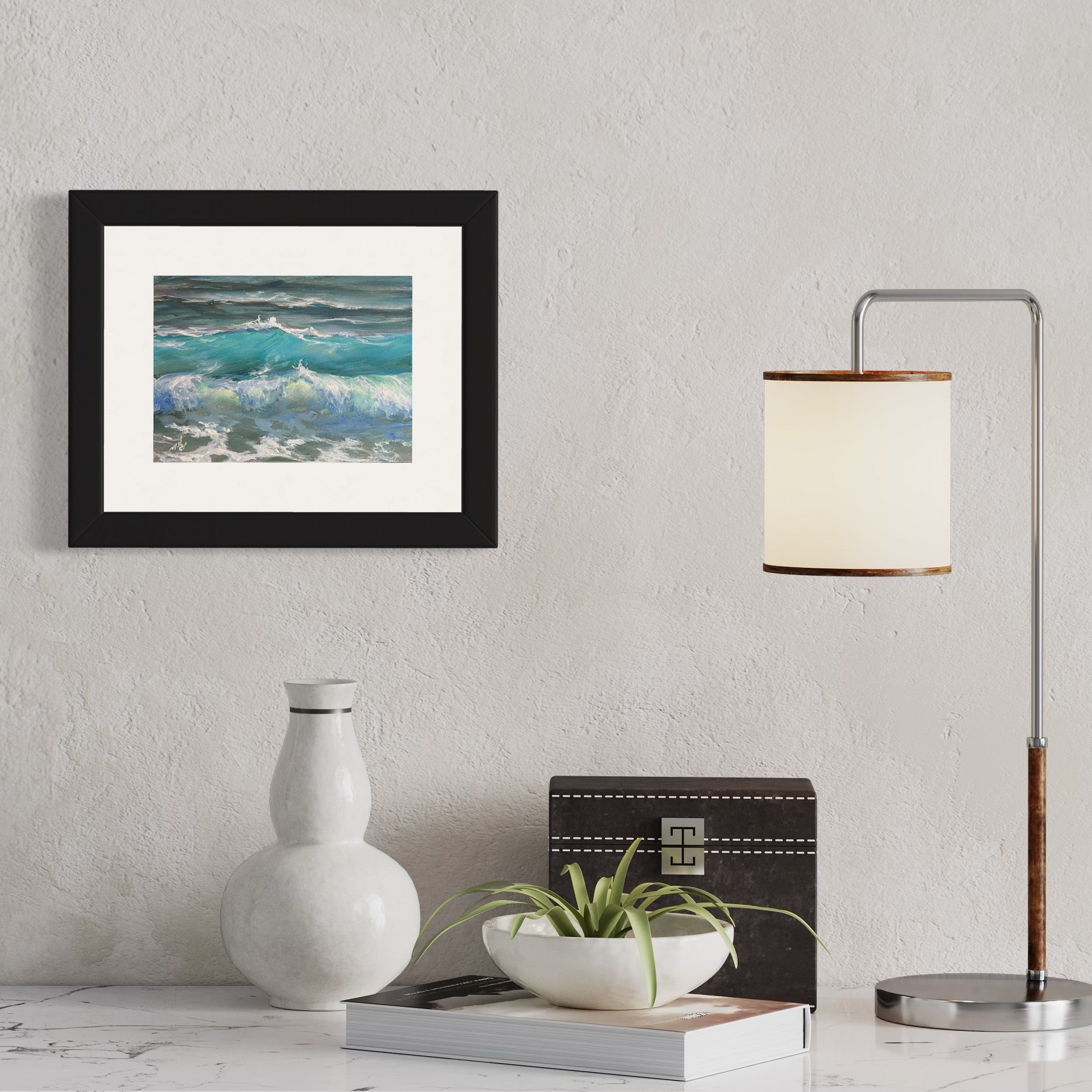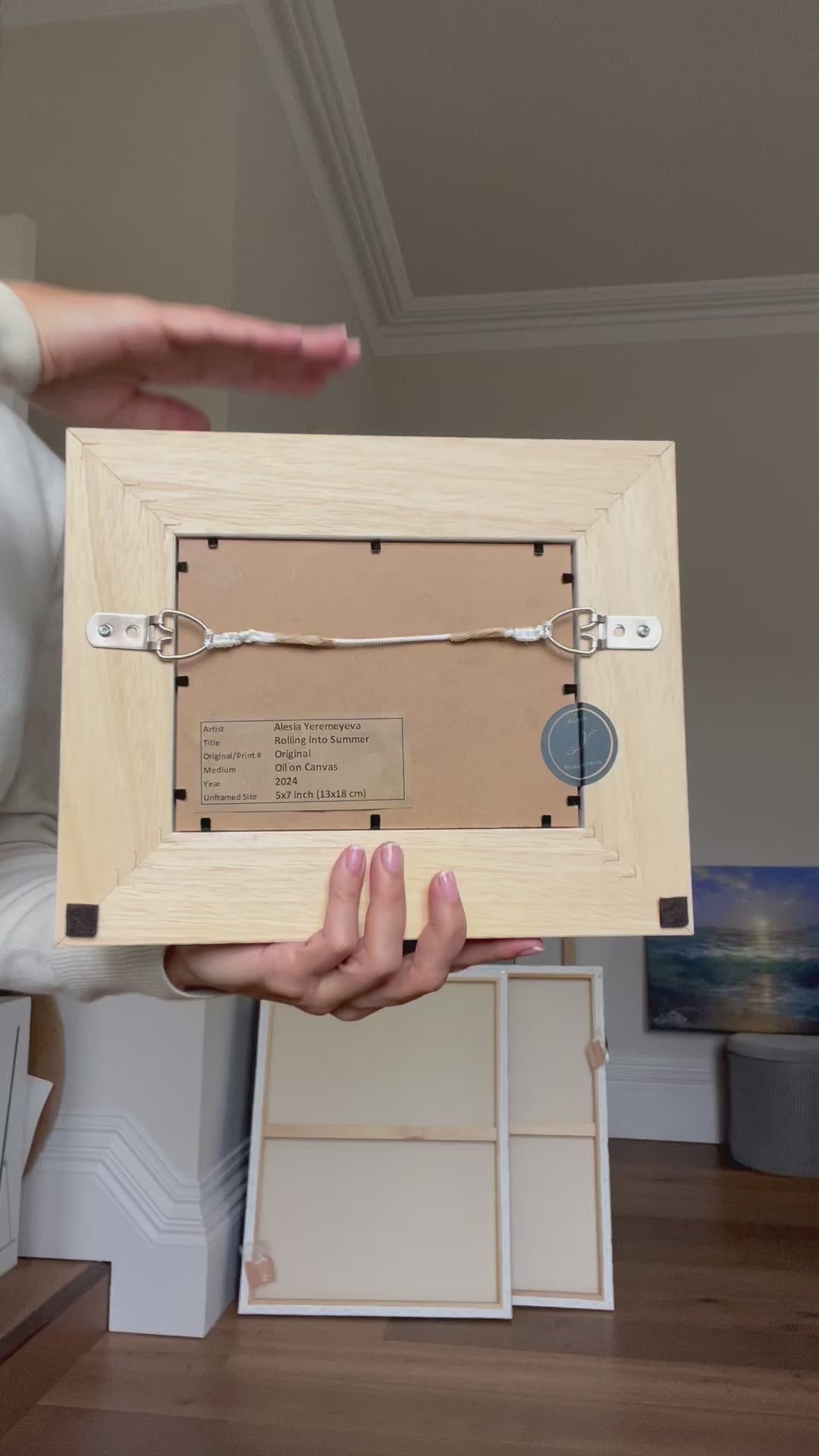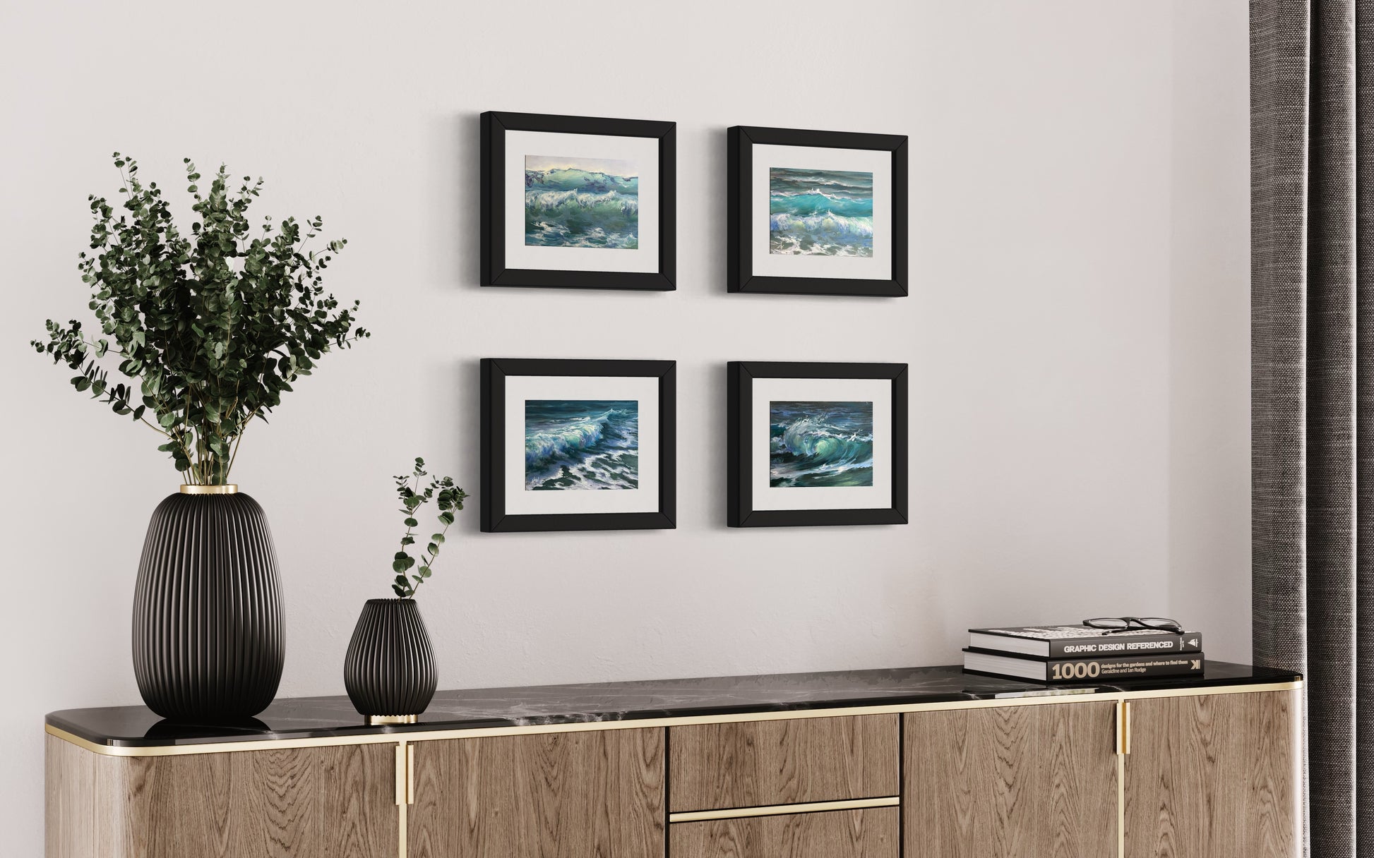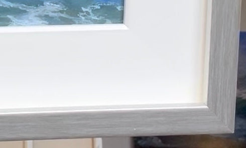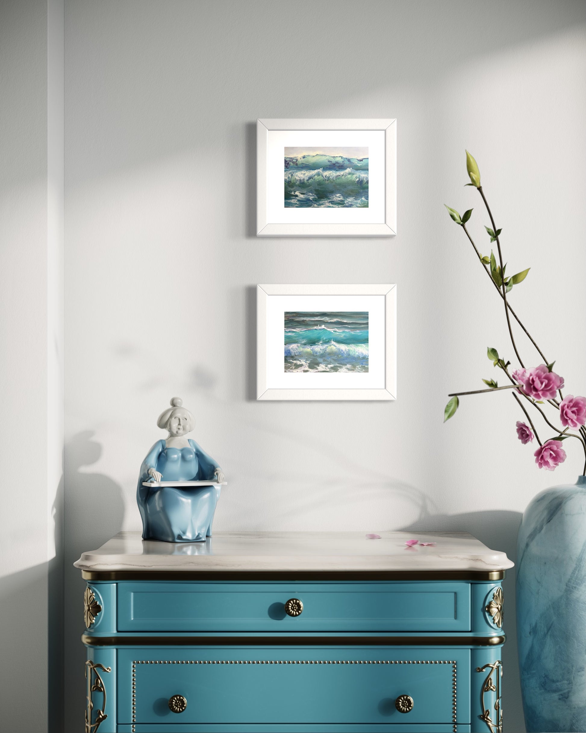 -White grain or Black wood: this original ocean painting is framed with high quality hand-made wooden frame and soft white mount , placed under low-reflective ClearView™ PlexiGlas (compare to normal glass), is signed and dated by me at the back.