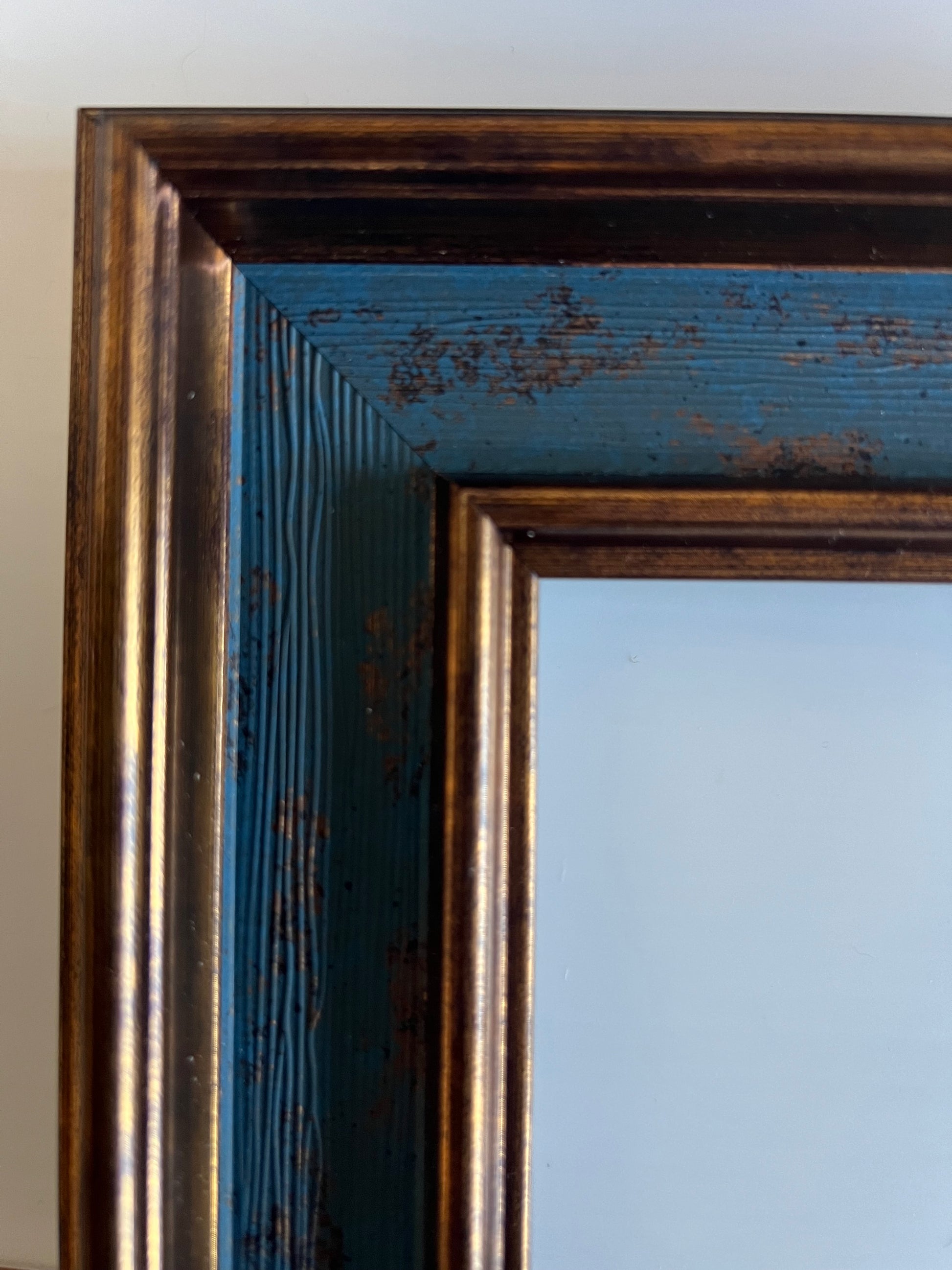 -Elegant solid frame dark (teal/bronze colour) - no glass required, ready to hang or stand. Size 21x26cm.