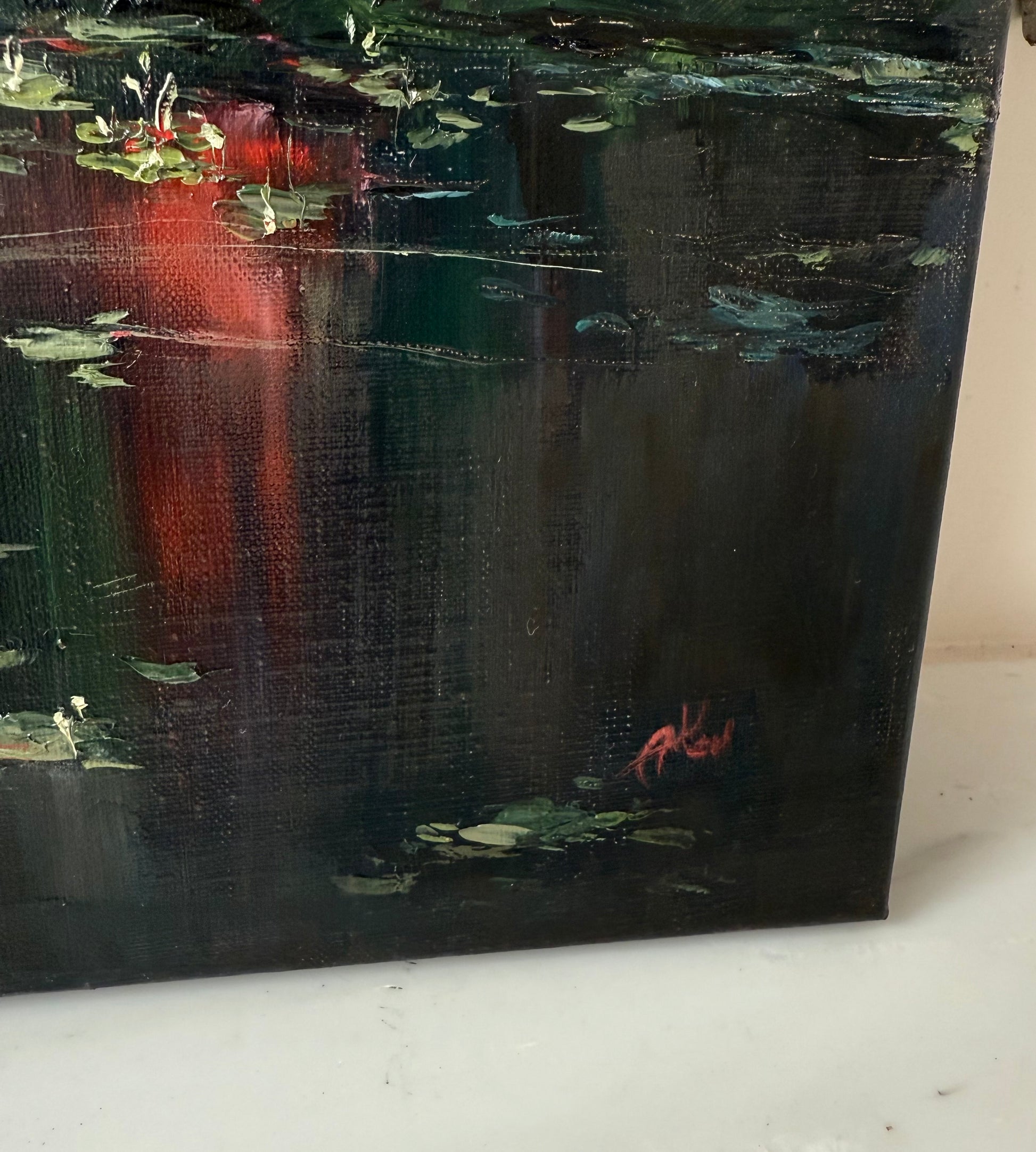 In this painting, I sought to capture the mystical essence of a secluded garden, a tranquil retreat shrouded in twilight. Using oil paints to blend realism with impressionistic touches, I portrayed light filtering through foliage, casting serene reflections on a still pond peppered with lilies. It's a visual escape into nature, meant to evoke peace and reflection, adding a serene ambiance to any room it adorns.