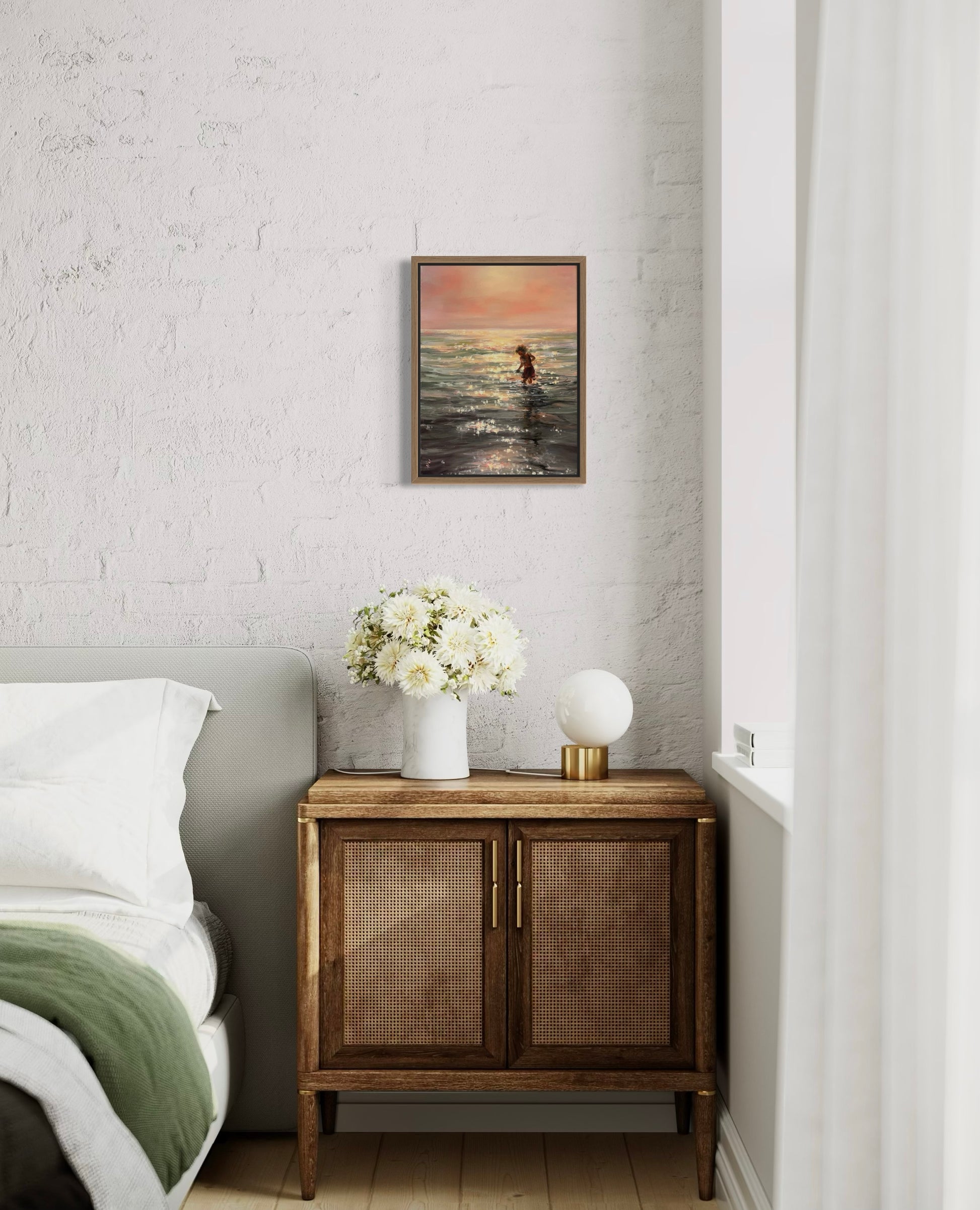 In this painting, I've captured the serenity of a young child playing in the vast, gentle embrace of the ocean. The merging styles of impressionism and realism reflect the fleeting, luminous moments of childhood against the timeless whisper of the waves. My use of oils enhances the depth and emotion, inviting a sense of calm and reflection into any space, evoking contemplation of the simple, pure moments of life.