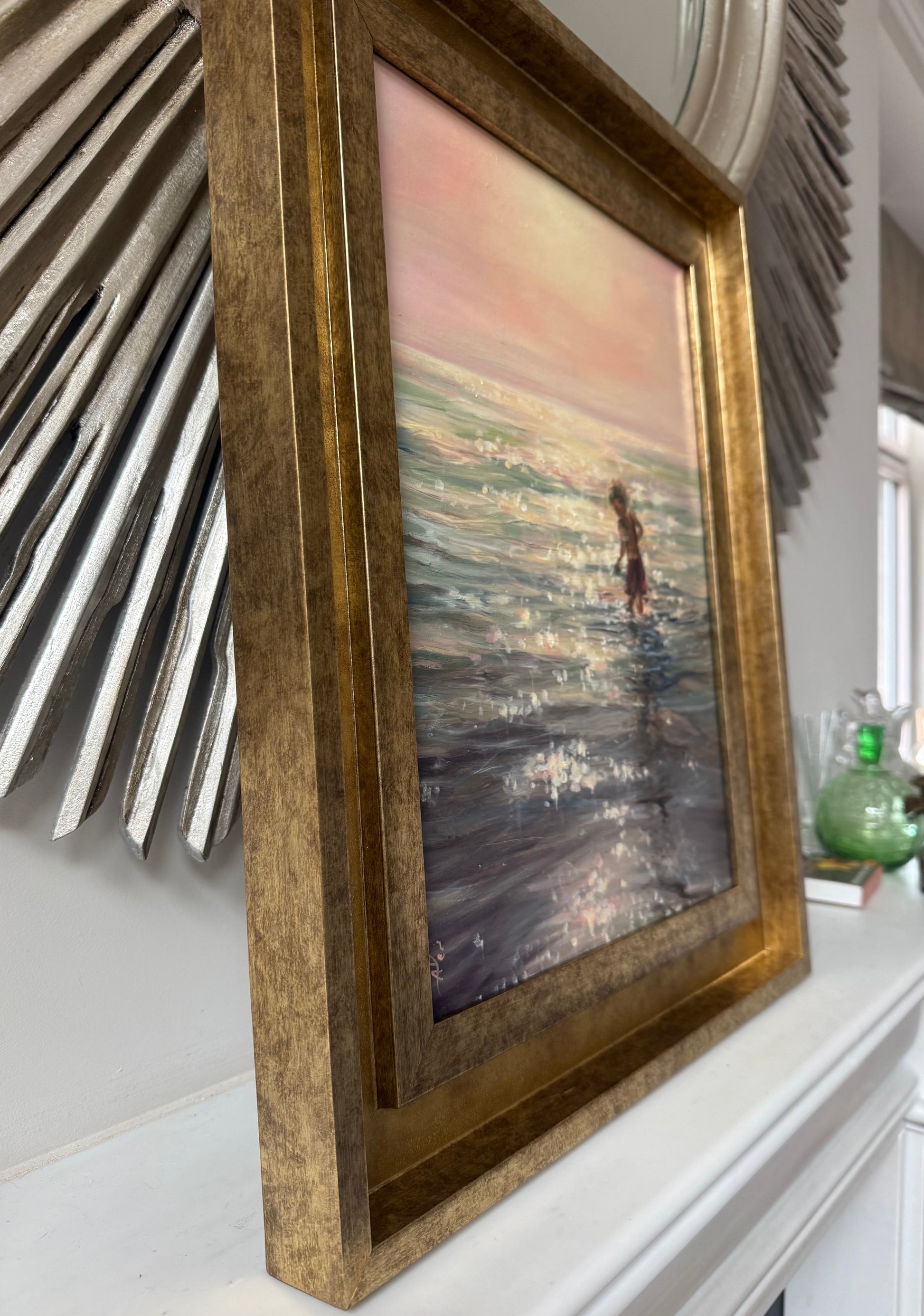 In this painting, I've captured the serenity of a young child playing in the vast, gentle embrace of the ocean. The merging styles of impressionism and realism reflect the fleeting, luminous moments of childhood against the timeless whisper of the waves. My use of oils enhances the depth and emotion, inviting a sense of calm and reflection into any space, evoking contemplation of the simple, pure moments of life.