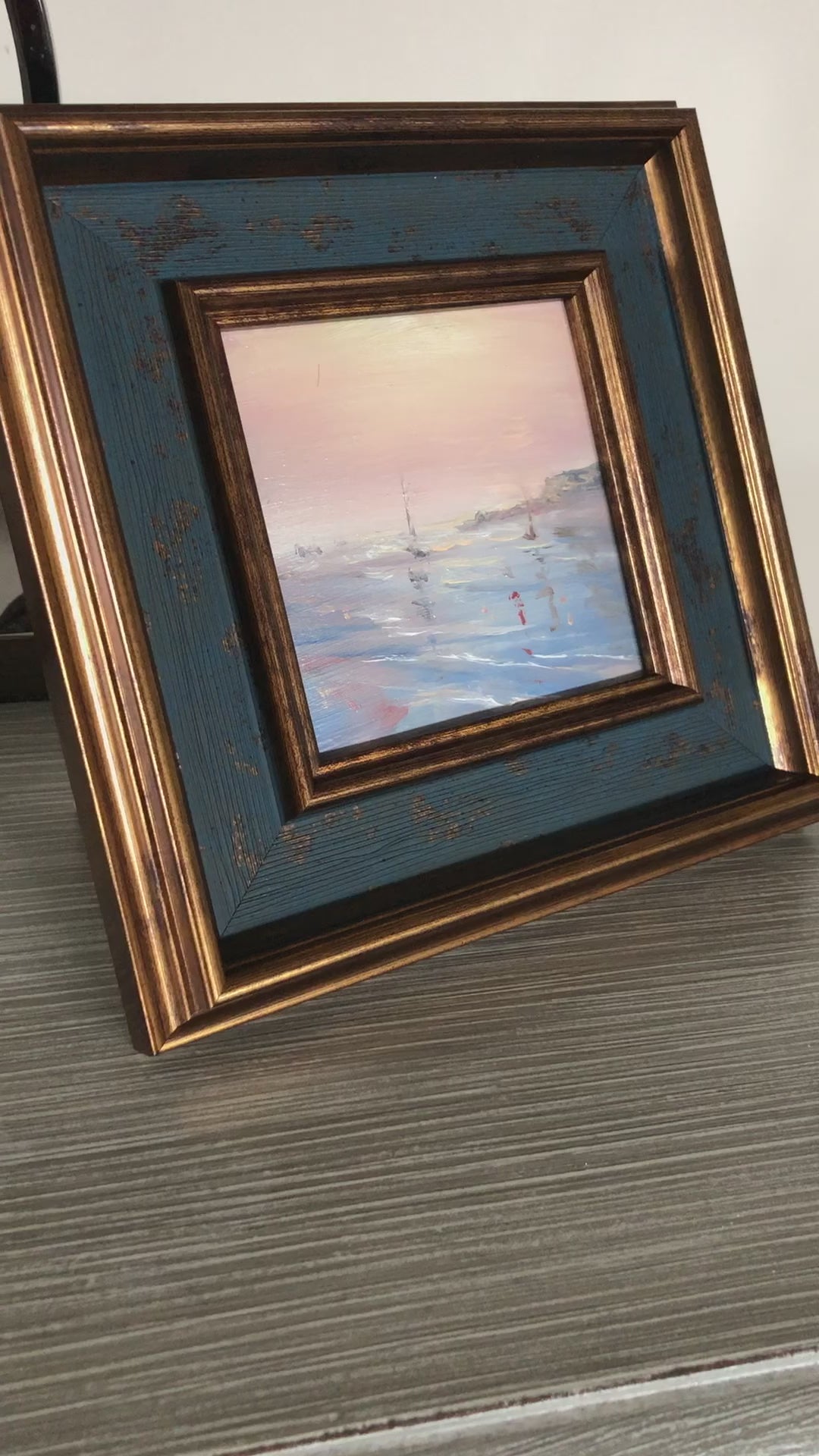 This original ocean painting is framed and ready to hang or stand, is signed and dated by me at the back. Perfect gift size. Solid elegant frame. Ready to stand or hang.
