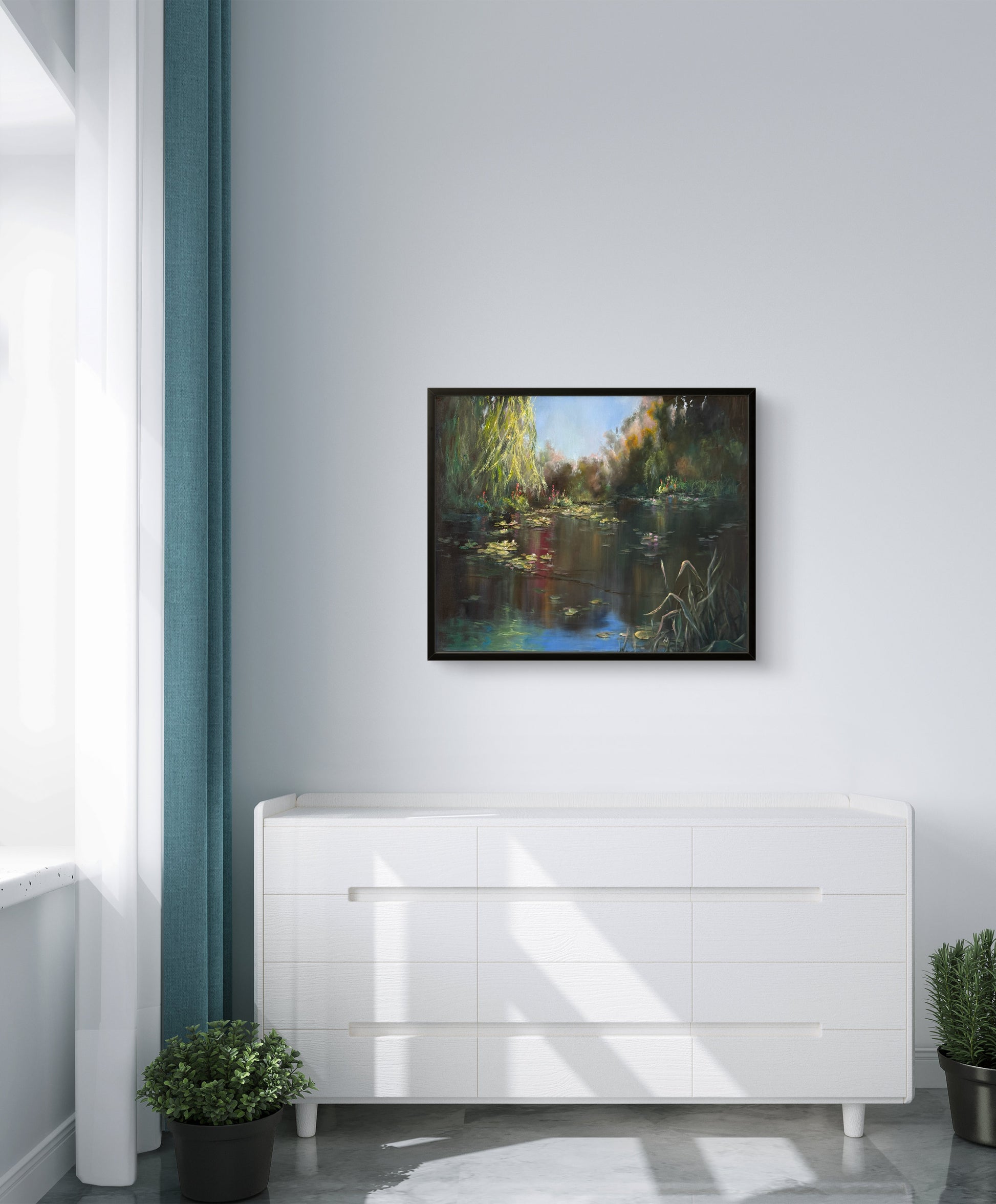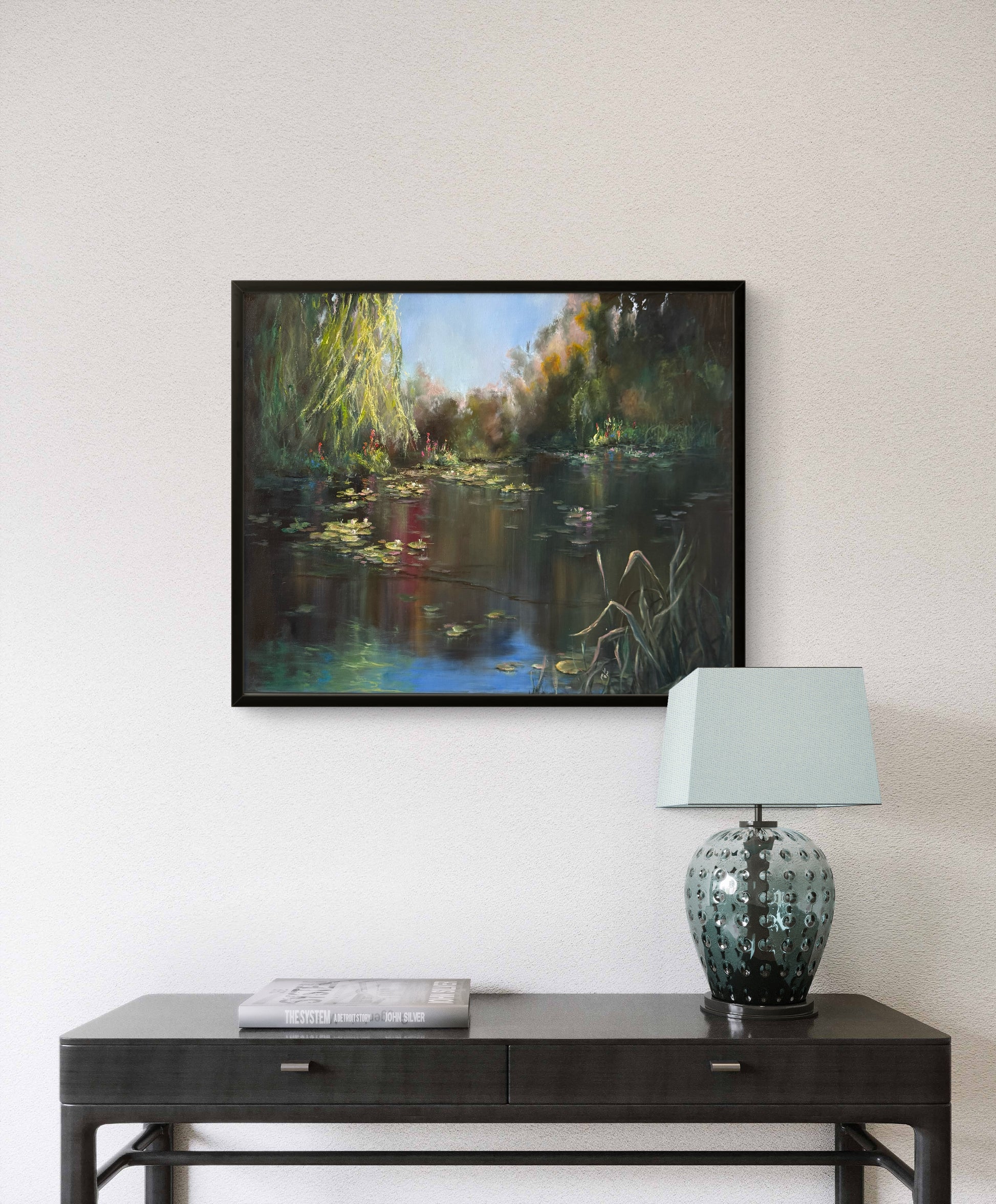 In this painting, I sought to capture the mystical essence of a secluded garden, a tranquil retreat shrouded in twilight. Using oil paints to blend realism with impressionistic touches, I portrayed light filtering through foliage, casting serene reflections on a still pond peppered with lilies. It's a visual escape into nature, meant to evoke peace and reflection, adding a serene ambiance to any room it adorns.